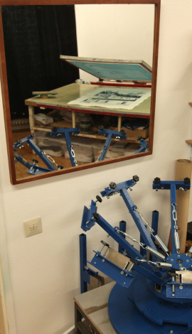 Die Siebdruckwerkstatt verfügt über einen Drucktisch (200x140) mit Ansaugung.
